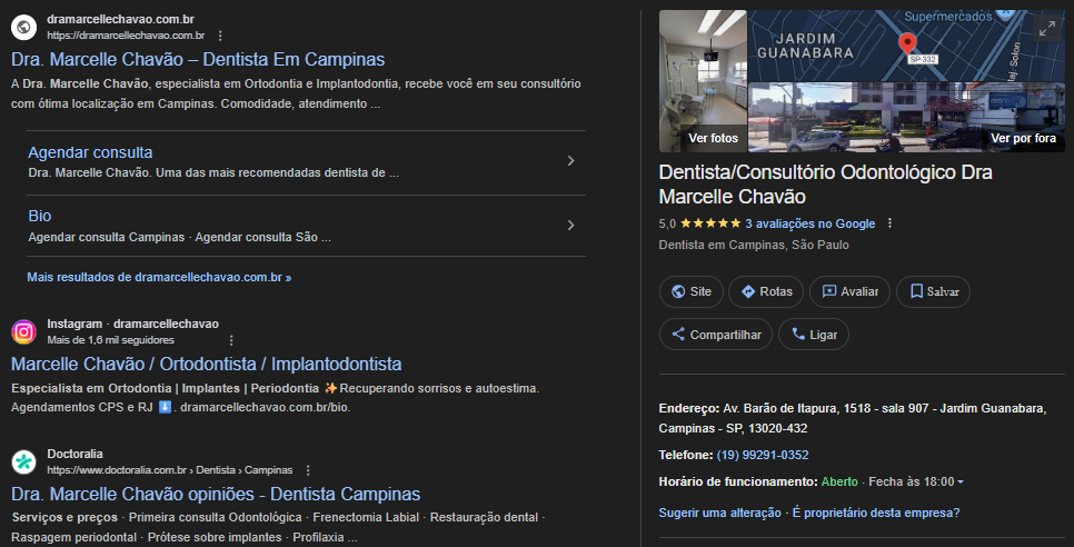 Para a Dra. Marcelle Chavão, realizamos a implantação completa da presença digital por meio do projeto “Start no Digital”, que inclui Google Meu Negócio, Google Ads, Meta Ads e landing page.