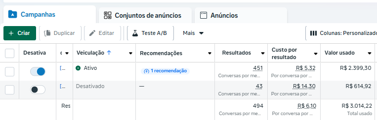 Resultado: 494 leads gerados pelo WhatsApp, com custo médio de apenas R$ 6,10 por contato — valor significativamente abaixo da média de mercado.